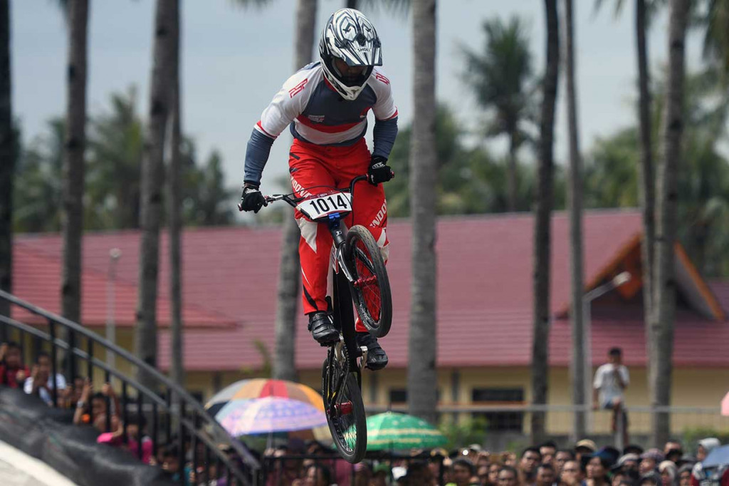 Banyuwangi: Atlet dari Indonesia National Team putra I Gusti Bagus Saputra menjadi juara men elite round kedua pada kejuaraan Banyuwangi International BMX 2018 di Sirkuit Muncar, Banyuwangi, Jawa Timur, Minggu, 15 Juli 2018. Antara Foto/Zabur Karuru Cek Berita dan Artikel yang lain di Google News