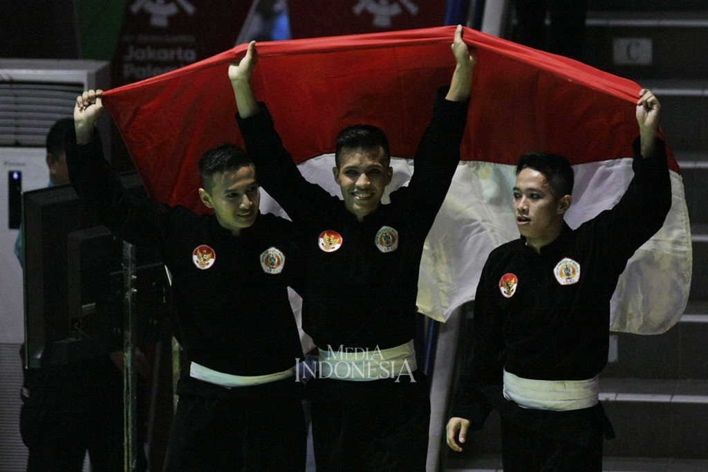 Jakarta: Pencak Silat kembali menyumbang medali emas buat Indonesia di Asian Games 2018. Emas ke-15 ini diraih pesilat Indonesia di nomor beregu putra di Padepokan Pencak Silat Taman Mini Indonesia Indah, Senin, 27 Agustus 2018. MI/Ramdani