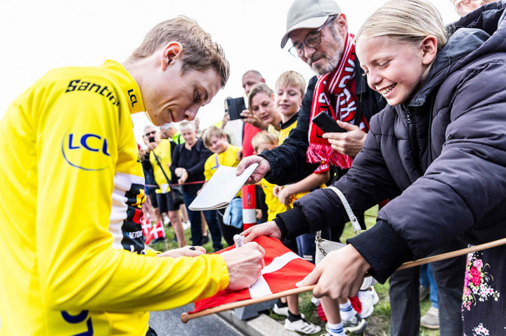 Pembalap berusia 26 tahun itu adalah petenis Denmark pertama yang memenangkan balapan ikonik itu sejak Bjarne Riis yang kemudian mengaku doping pada 1996.