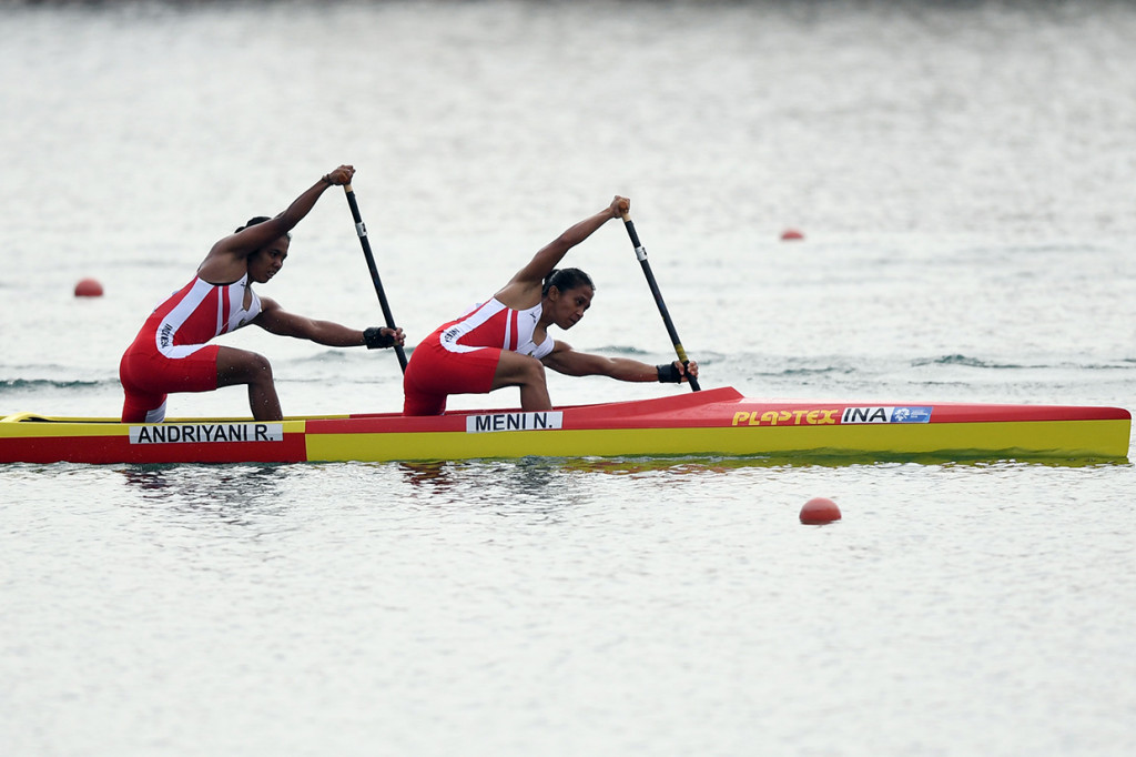 Palembang: Tim dayung Indonesia, Andriyani Riska/Meni Nur, harus puas meraih medali perunggu kano ganda putri 500 meter Asian Games 2018 di Jakabaring Sports City (JSC) Palembang, Sumsel, Kamis, 30 Agustus 2018. Pada nomor ini, ada sembilan negara yang berkompetisi. Riska/Meni finis di urutan ketiga setelah mencatatkan waktu 2 menit 7,356 detik. Antara Foto/INASGOC/Afp Photo Cek Berita dan Artikel yang lain di Google News