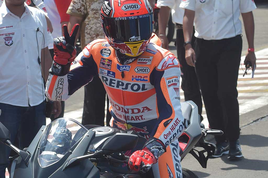 Metrotvnews.com, Bogor: Juara Dunia MotoGP Marc Marquez menjajal Sirkuit Sentul, Bogor, Jawa Barat, Selasa (25/10/2016). Marquez memberikan coaching clinic kepada pembalap belia Indonesia sembari menjajal trek Sirkuit Sentul dengan mengendarai motor Honda CBR125R. AFP/Adeh Berry Cek Berita dan Artikel yang lain di Google News