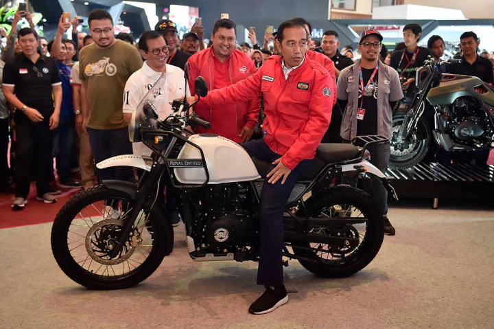 Jakarta: Presiden Joko Widodo meninjau pameran sepeda motor bertajuk Indonesia Motorcycle Show (IMOS) 2018 di Jakarta Convention Center, Jakarta, Sabtu, 3 November 2018. Jokowi sempat menaiki sepeda motor yang dipamerkan. Antara Foto/Puspa Perwitasari Cek Berita dan Artikel yang lain di Google News