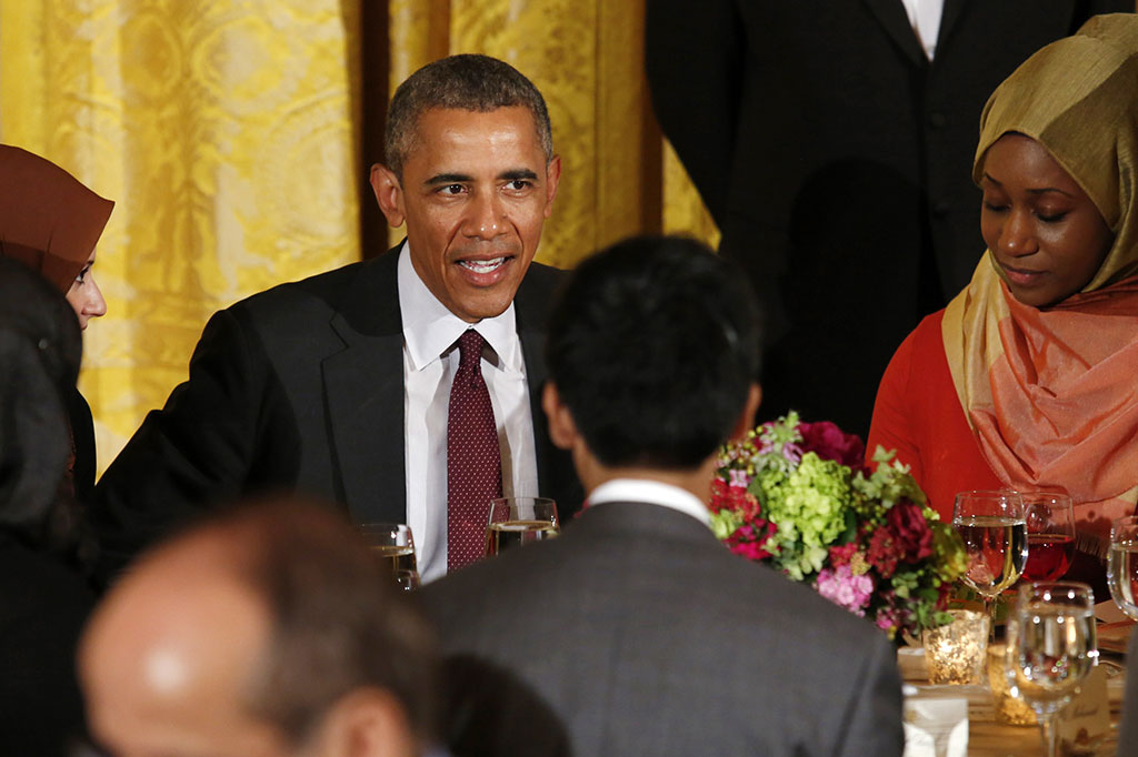 Presiden AS Barack Obama berbincang-bincang dengan para tamu di sela-sela acara buka puasa bersama di Gedung Putih