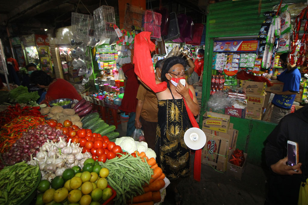 Surabaya: Seorang seniman Ludruk, Meimura melakukan kegiatan blusukan ke Pasar Kembang, Surabaya, Jawa Timur, Sabtu, 22 Agustus 2020. Dalam blusukan tersebut, Meimura sekaligus melakukan sosialisasi protokol kesehatan guna mencegah potensi penyebaran covid-19.