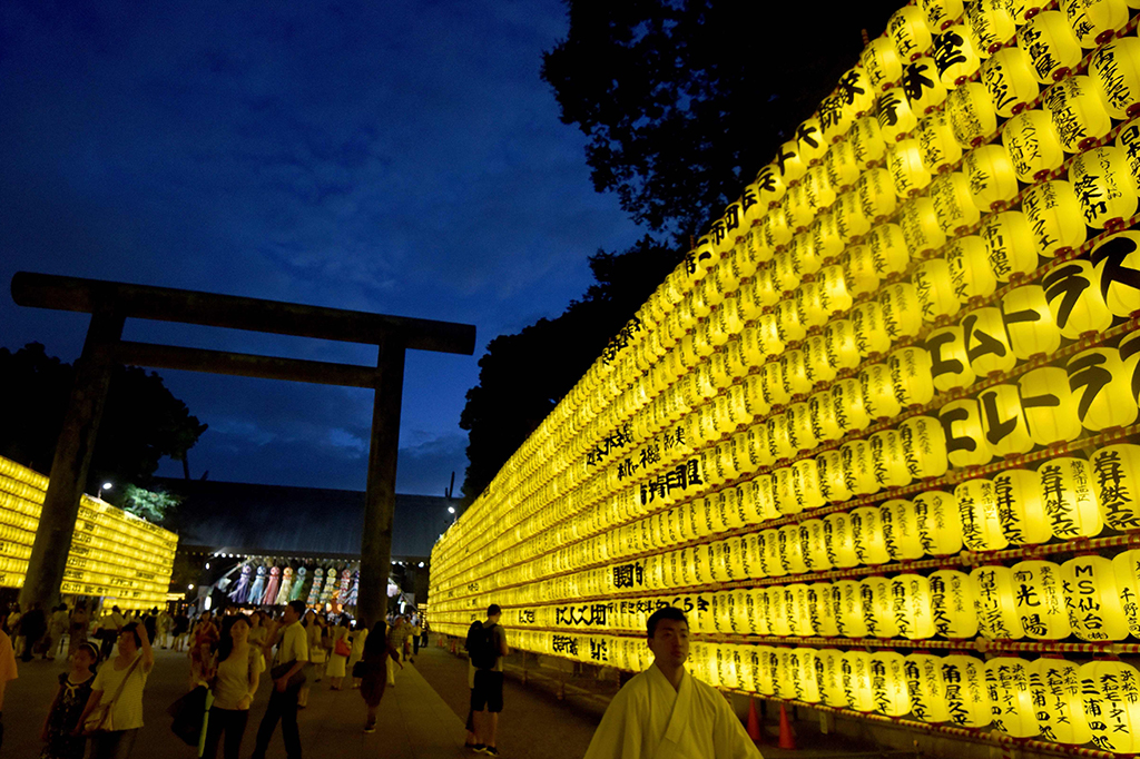 Sekitar 300.000 orang datang ke festival Mitama Matsuri di Kuil Yasukini, Tokyo. Acara tahunan ini merupakan salah satu festival obon terbesar di Tokyo.