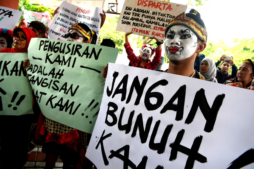 Dalam aksinya mereka memprotes tindakan dinas Kebudayaan dan Pariwisata setempat yang mengambil gamelan dan mengunci Gedung Kesenian Pringgondani di THR.