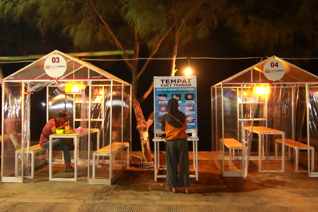 Banyuwangi: Untuk mendorong perekonomian masyarakat pesisir pada masa adaptasi kebiasaan baru, Pemerintah Daerah Banyuwangi membangun Pondok Terawang, sebagai pusat kuliner yang telah terverifikasi oleh Gugus Tugas Percepatan Penanganan Covid-19. ANTARA FOTO/Budi Candra Setya Cek Berita dan Artikel yang lain di Google News