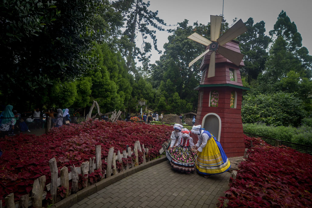 Wisatawan berfoto dengan latar belakang kincir angin khas Negara Belanda di Wisata Farm House Lembang, Kabupaten Bandung Barat, Jawa Barat, Kamis, 2 Januari 2020.