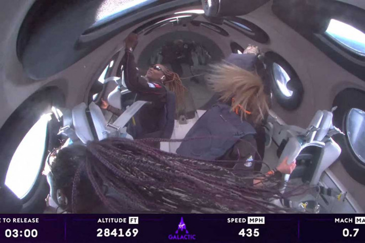 "Mereka secara resmi astronaut. Selamat datang di luar angkasa," kata penyiar Virgin Galactic, Sirisha Bandla saat pesawat ruang angkasa didorong di atas ketinggian 80 kilometer (50 mil), level yang menandai tepi ruang di mana tarikan gravitasi minimal.