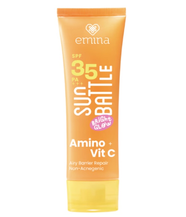 Emina Sun Battle Bright Glow diformulasikan dengan Encapsulated UV Filter untuk perlindungan dari sinar UVA dan UVB. Kandungan utamanya ada pada Amino Vit C, berfokus pada pencerahan kulit dan memudarkan flek hitam secara lembut. Harga Rp34 ribu.