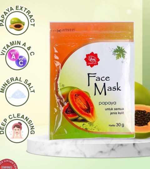 Pepaya mengandung enzim papain yang kaya manfaat untuk kecantikan kulit. Seperti pada masker pepaya Viva ini yang mengandung vitamin A dan C, garam mineral, serta enzim papain dari pati buah pepaya.