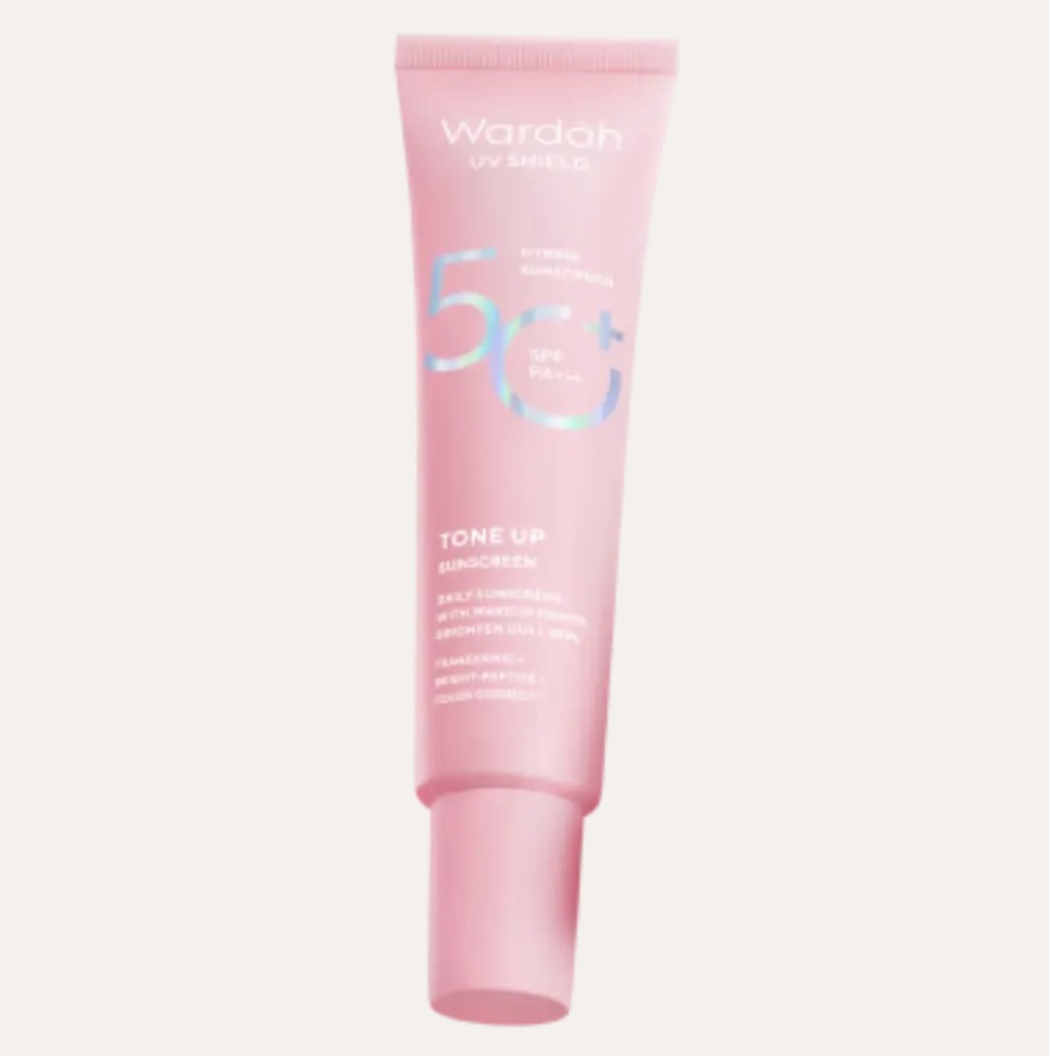 Wardah UV shield tone up sunscreen serum dengan SPF 50+ PA+++ memberikan perlindungan UV kuat sambil memberikan efek tone-up alami yang langsung mencerahkan kulit, cocok untuk semua warna kulit tanpa terlihat artifisial.