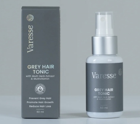 Varesse Grey hair tonic menggunakan bahan aktif seperti multi herb extract yang dapat membantu menghitamkan rambut uban, mengurangi kerontokan, dan mempercepat pertumbuhan rambut baru.