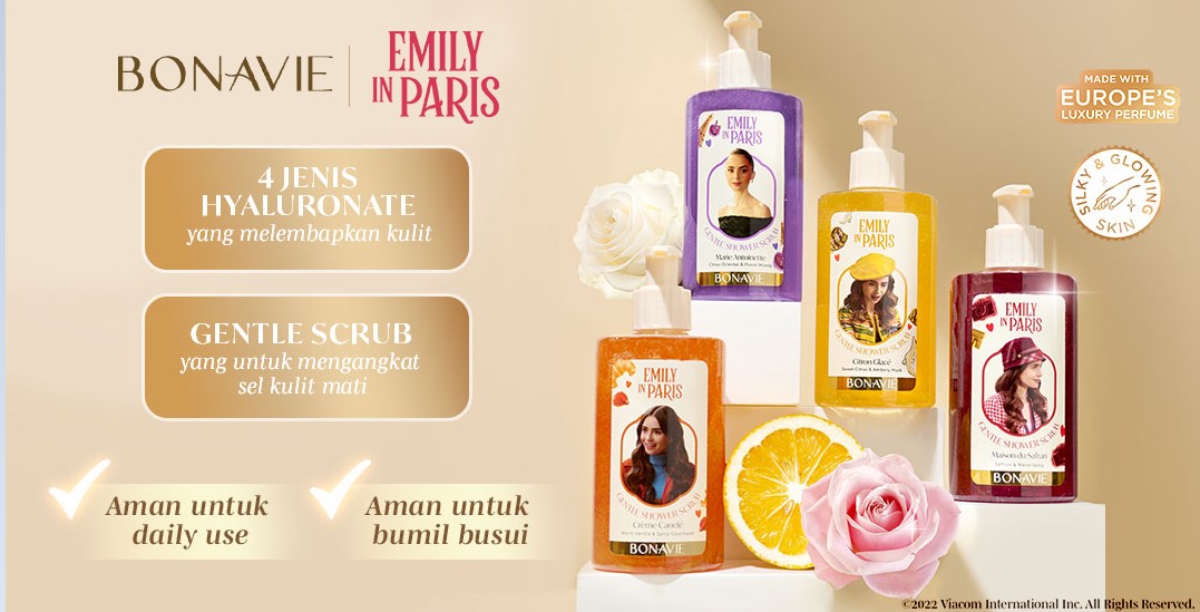 Hadir juga Bonavie Body Wash Emily in Paris Edition yang menghadirkan Bonavie Gentle Shower Scrub dengan empat varian yang memiliki wangi dan karakter beragam serta terinspirasi dari parfum mewah; Creme Canele, Marie Antoinette, Citron Glace, dan Maison du Safran.