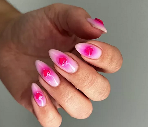 Betapa asyiknya desain kuku airbrush pink dan merah ini. Mengutip laman Instyle, mulailah dengan alasnya, lalu balikkan warnanya untuk mengisi stensil hati di atasnya. Jika tidak memiliki mesin airbrush, kamu bisa menggunakan spons.