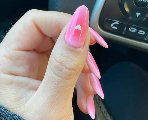 Meskipun kuku aura menjadi perhatian utama, lihatlah desain baby pink dan putih sederhana ini. Artis Hollywood yang memukau, Rachel Joseph, menciptakan nail art ini dengan basis aura merah muda dua warna yang diakhiri dengan hati putih mungil di tengah setiap mekarnya.