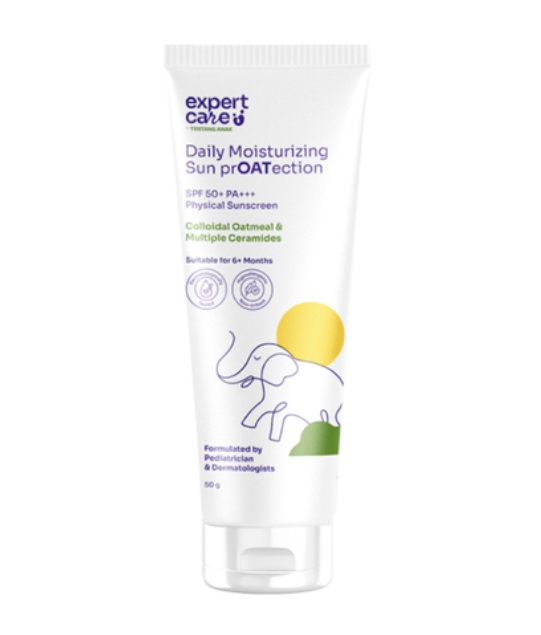 Bahan utamanya termasuk zinc oxide dan titanium dioxide yang melindungi dari sinar matahari tanpa menyumbat pori-pori kulit, bisabolol untuk menenangkan kulit dengan antioksidan dan antiinflamasi, serta vitamin E yang menutrisi dan menjaga kelembapan kulit si kecil. Harga: Rp90 ribu.