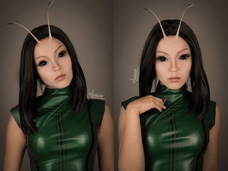 Untuk karakter Mantis dari Guardians of The Galaxy, mulai dengan foundation lebih terang atau concealer untuk wajah cerah. Pakai highlighter putih di bawah mata, hidung, dan dagu.