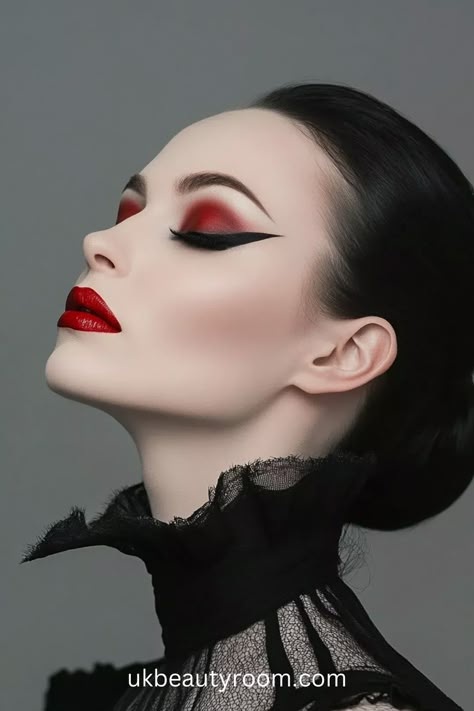 Make up vampir cantik ini simpel dan memukau! Mulai dengan foundation terang untuk wajah pucat seperti bangkit dari kubur, lalu pakai eyeshadow merah bold di kelopak mata.