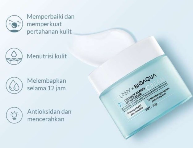 Moisturizer ini dari Bioaqua 7X ceramide menggabungkan 7 bahan aktif seperti ceramide, hyaluronic acid, salicylic acid, niacinamide, dan centella asiatica yang bekerja bersama untuk mengatasi masalah kulit seperti jerawat, kemerahan, kulit kasar, atau kering dengan cara yang cepat tapi aman bagi lapisan kulit.