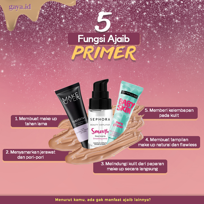 Kamu dapat menghasilkan make up yang lebih flawless dan membuat wajahmu terlihat lebih indah dibanding tanpa mak eup. Kekurangan di wajahmu menjadi lebih mudah diminimalisir jika kamu menggunakan primer yang sesuai dengan kebutuhan kulit.