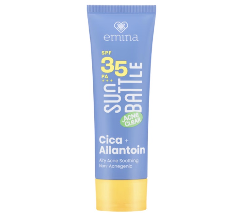 Emina sun battle SPF 35 PA+++ acne clear cica + allantoin airy acne Soothing siap melindungi kulit dari sinar UV dengan tekstur yang ringan, mudah meresap ke dalam kulit, dan tanpa meninggalkan whitecast.