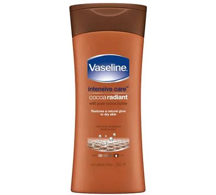 Dirancang untuk membantu menjaga kelembapan kulit, sehingga kulit tampak lebih sehat dan bercahaya. Produk ini dilengkapi dengan formula Vaseline Jelly Micro-Droplets, sehingga dapat mengunci kelembapan kulit dengan lebih lama tanpa meninggalkan rasa lengket.Juga, mengandung pure cocoa butter yang dapat menutrisi dan membuat kulit tampak lebih bercahaya. Uniknya, body lotion khusus untuk kulit kering ini memiliki aroma coklat yang lembut dan manis. Harga Rp57 ribuan.