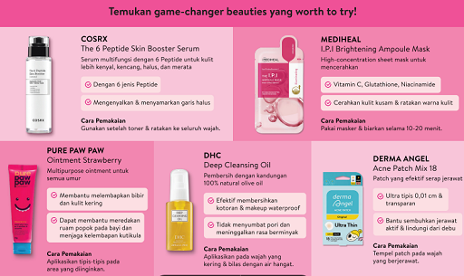 Sementara, Pure Paw Paw Ointment Strawberry salep serbaguna multifungsi, COSRX The 6 Peptide Skin Booster Serum dengan enam jenis protein yang bermanfaat untuk membantu kulit wajah lebih sehat dan glowing. Ada juga Derma Angel Acne Patch, stiker jerawat andalan para GenZ.