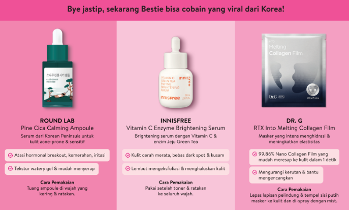 Kamu bisa mencoba Round Lab Pine Cica Calming Ampoule yang dapat menenangkan kulit wajah dan meredakan peradangan akibat jerawat, atau INNISFREE Vitamin C Green Tea Enzyme Brightening Serum, juga Dr.G RTX Into Melting Collagen Film, masker film kolagen yang membantu memberikan hidrasi kulit sempurna dan dapat meningkatkan elastisitas kulit.