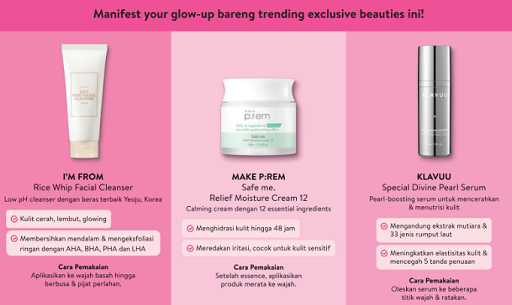 Sebut saja I’m From GWP Rice Whip Facial Cleanser, pembersih wajah yang mengandung beras terbaik dari Yeoju, Make P:Rem Safe Me Relief Moisture Cream, pelembap lembut dan ringan dengan pH 5.5 untuk kulit sensitif. Ada juga Klavuu Special Divine Pearl Serum, serum mutiara khusus yang intens menutrisi kulit dan meningkatkan elastisitas kulit.
