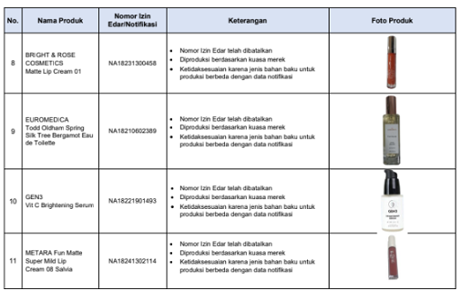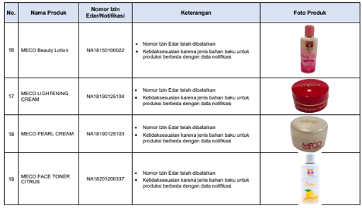 "Sesuai ketentuan tersebut, BPOM telah melakukan tindakan tegas dalam bentuk sanksi administratif, yaitu pencabutan izin edar/notifikasi terhadap ke-21 produk kosmetik serta perintah untuk melakukan penarikan dan pemusnahan kosmetik bagi pelaku usaha," jelas Taruna.