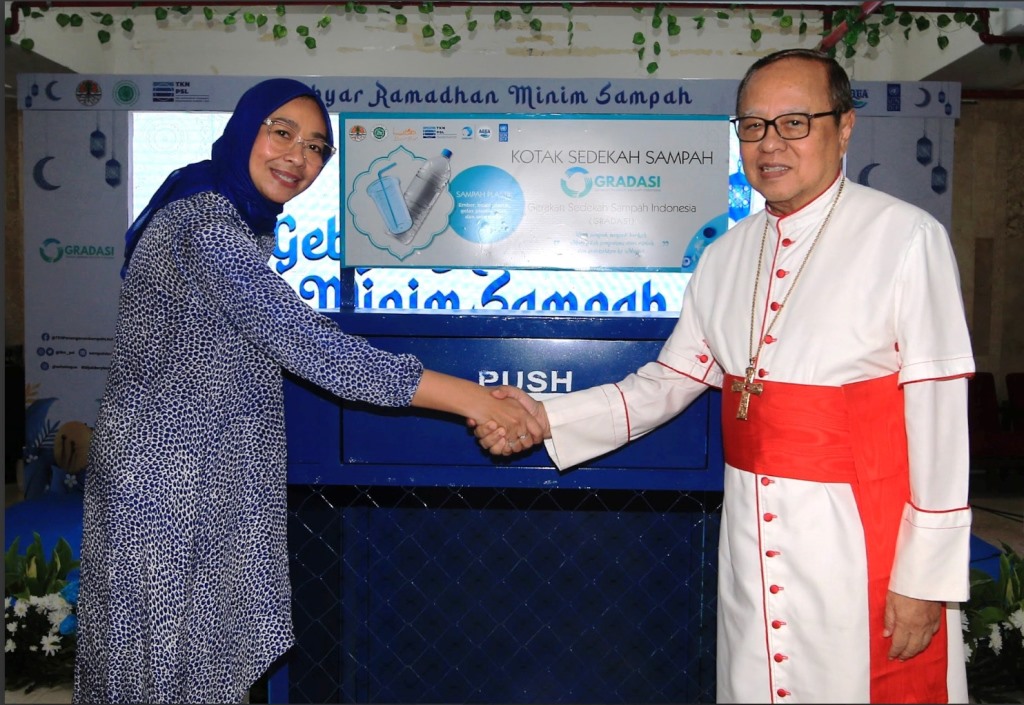 Vera Galuh Sugijanto, VP General Secretary Danone Indonesia mewakili GRADASI menyerahkan menyerahkan kotak sedekah sampah secara simbolis kepada perwakilan tokoh agama, Ignatius Kardinal Suharyo, Uskup Agung Jakarta.