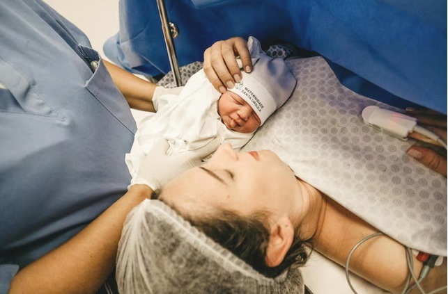 Bayi baru lahir ditempatkan di dada dan ditutupi dengan handuk hangat segera setelah persalinan.