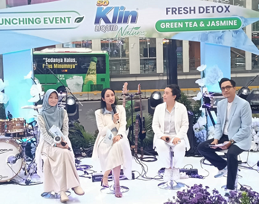 (Ki-ka: Dinda Shabrina, Research & Collaboration Manager NAFAS Foundation, dr. Nadia Alaydrus, Content Creator sekaligus Ahli Kesehatan, Joanna Elizabeth Samuel, Marketing Manager Fabric Care Category WINGS Group Indonesia, dan MC dalam acara peluncuran "SoKlin Liquid Nature Fresh Detox", Jumat (17/10/2025), di Jakarta. Foto: Dok. Yuni)