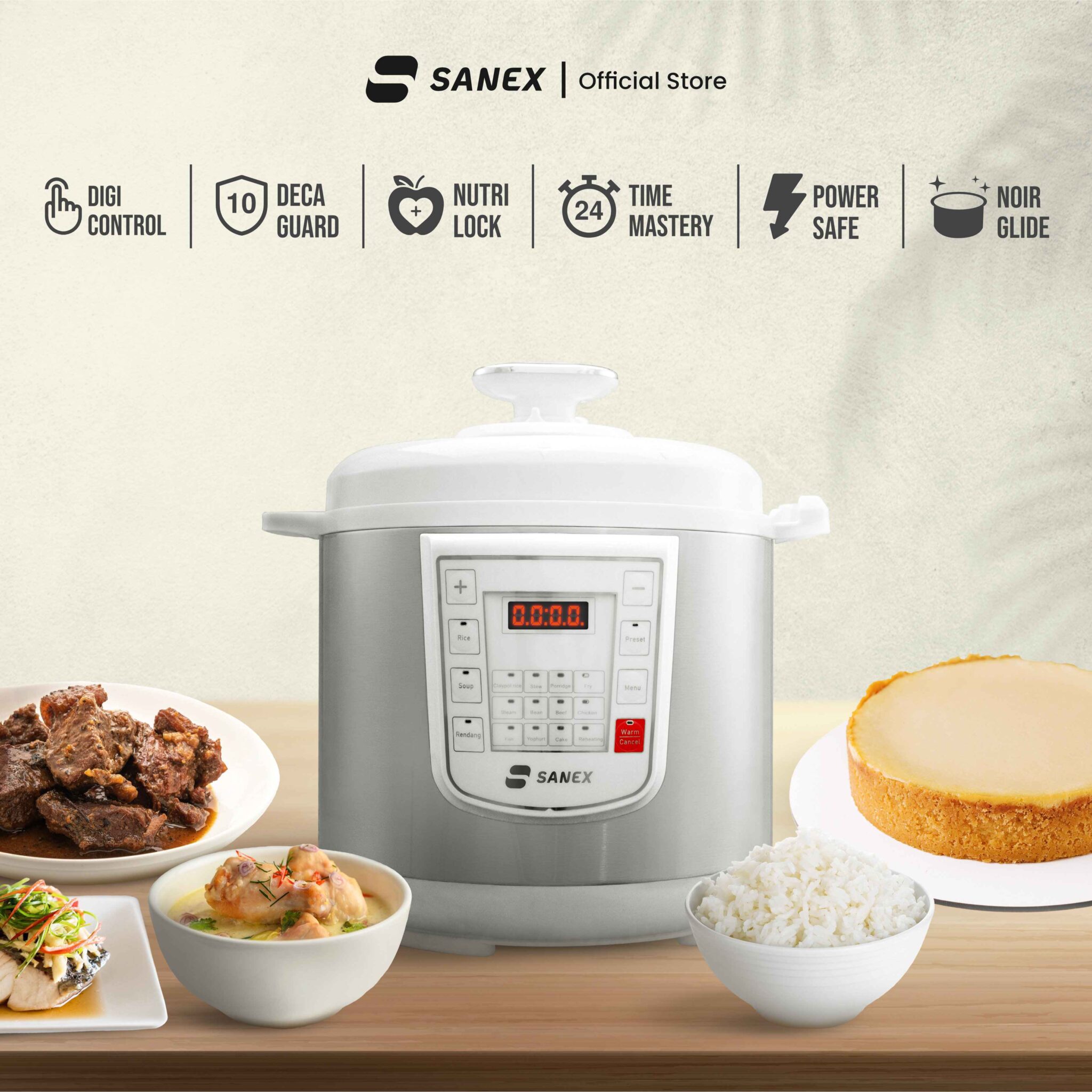 Hadir dengan 16 fungsi memasak, mulai dari menanak nasi, mengukus, memanggang kue, hingga memasak rendang. Fitur Time Mastery memungkinkan pengaturan waktu otomatis hingga 24 jam agar masakan matang tepat waktu.