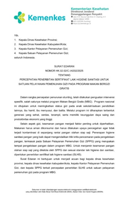 Jakarta: Kementerian Kesehatan (Kemenkes) menerbitkan Surat Edaran Nomor HK.02.02/C.I/4202/2025 tentang Percepatan Penerbitan Sertifikat Laik Higiene Sanitasi (SLHS) bagi Satuan Pelayanan Pemenuhan Gizi (SPPG) dalam program Makan Bergizi Gratis (MBG).