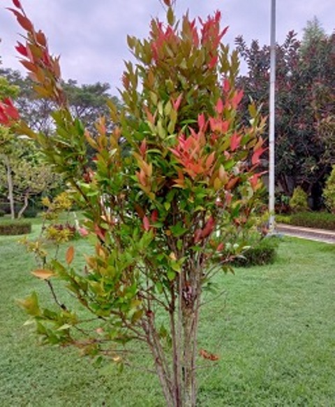 Warna daunnya kehijauan di bagian bawah, warna merah ada di bagian pucuk. Daun pucuk yang berwarna merah ini diketahui mengandung banyak senyawa alami yang berpotensi digunakan sebagai pengobatan herbal.