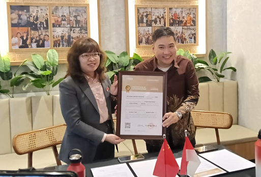 (Xia Hong Qiao, Director Wuyi Tachiso Drinkware Corporation China dan Christian, Director PT Usaha Sukses Sentosa (USS) saat peresmian perjanjian kerja sama distribusi eksklusif TYESO, pada Rabu (17/12/2025), di Aming Coffee La Vela, Greenlake City, Tangerang. Foto: Dok. Yuni)