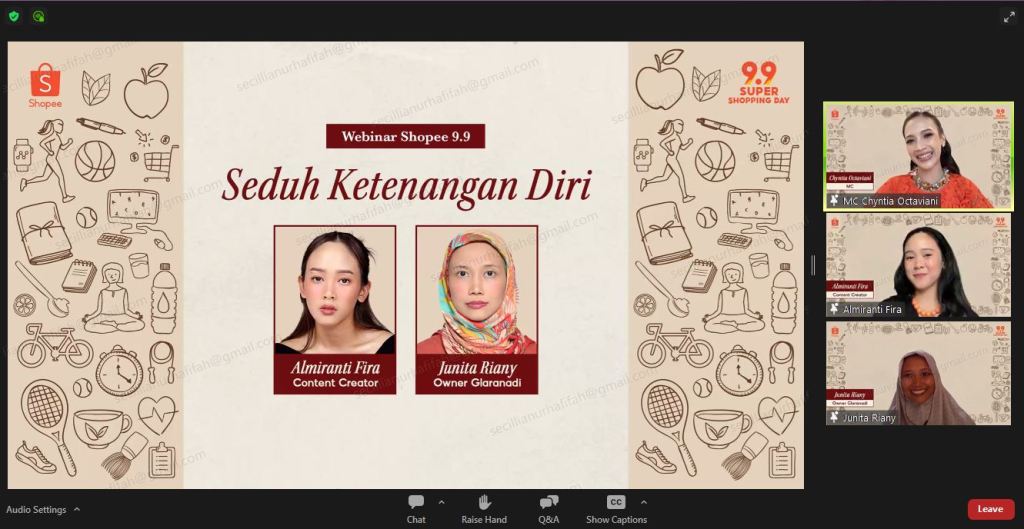 Webinar Shopee 99 Super Shopping Day berjudul “Seduh Ketenangan Hati” berhasil digelar pada tanggal 22 Agustus 2025 yang menggandeng Almiranti Fira, seorang content creator dan Junita Riany, selaku owner Glaranadi. Dok. Ss/Secillia Nur Hafifah