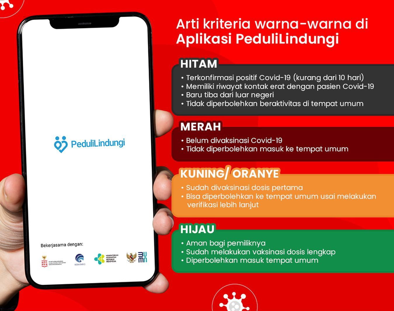 Karena itu, Sari merasa pentingnya masyarakat untuk mengenali arti dari empat warna yang ada di PeduliLindungi. Seperti diketahui, ada empat warna di PeduliLindungi yang mencerminkan status penggunanya, yaitu hijau, kuning, merah, dan hitam.