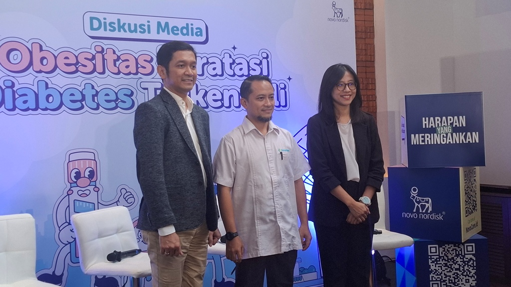 Foto ki-ka: Ketua Bidang Organisasi Himpunan Studi Obesitas Indonesia (HISOBI) dan Ketua Klaster MVA IMERI FKUI - dr. Dicky Tahapary, Sp.PD-KEMD, PhD, Ketua Tim Kerja Metabolik dan Surveilans PKG (Pemeriksaan Kesehatan Gratis), dr. A. Muchtar Nasir, M.Epid, dan Clinical, Medical, and Regulatory Director Novo Nordisk Indonesia, dr. Riyanni Meisha Tarliman. Dok. Aulia/Medcom