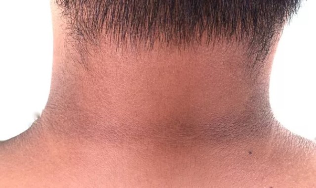 Perubahan kulit ini juga dikenal sebagai akantosis nigrikans, adalah bercak-bercak gelap dan menebal yang sering muncul di lipatan tubuh seperti leher, ketiak, atau selangkangan.