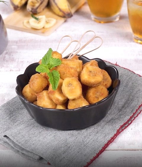 - 4. Goreng pisang dalam minyak banyak panas hingga berwarna kuning keemasan dan matang. Angkat, tiriskan. Sajikan