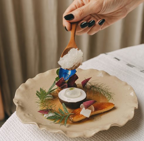 Kreasi lainnya seperti Sepia dengan black garlic dan lemon kosho, serta Hamachi dengan semangka dan kelapa, mencerminkan hubungan mendalam restoran ini dengan para petani, nelayan, dan pengrajin lokal.