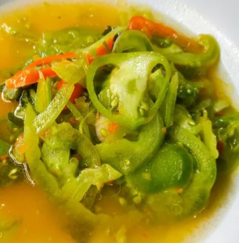 1. Dalam sebuah mangkuk, aduk rata tomat hijau, bawang merah, cabai rawit merah, dan cabai rawit hijau