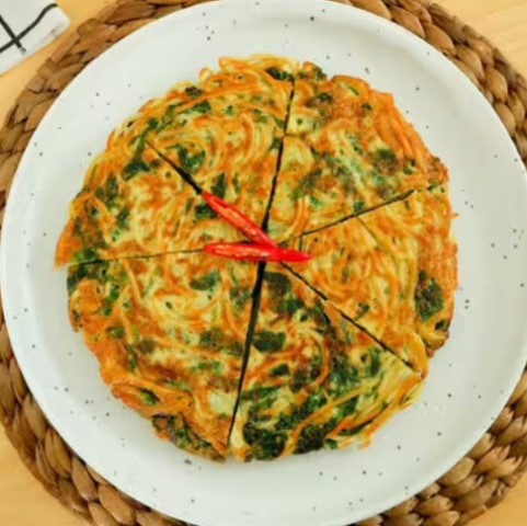 6. Potong-potong omelet mi, sajikan selagi hangat dalam piring saji.