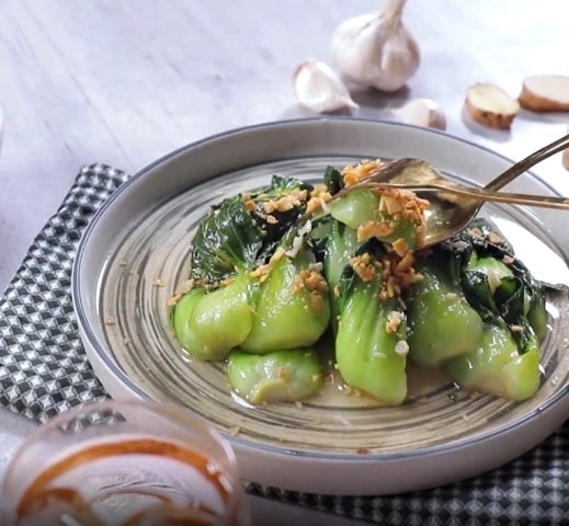 5. Sajikan tumis pakcoy dengan taburan bawang putih