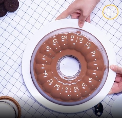 4. Tuang ke dalam cetakan yang sudah ada lapisan cokelat dan biarkan dingin