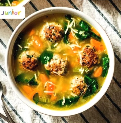 Yuk, bikin bakso ayam dengan campuran bayam homemade untuk Junior! Menu ini cocok disajikan untuk usia sembilan bulan ke atas. Baksonya gurih dengan kuah kaldu ayam dan tambahan sayur bayam serta wortel.
