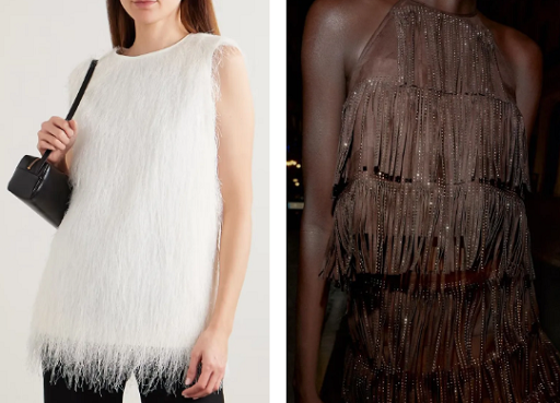 Disebut sebagai tren atasan yang paling dramatis. Para desainer menampilkan detail rumbai yang sangat menarik perhatian. Ada banyak variasi berani dari merek-merek ternama dan mewah di pasaran saat ini; namun, jika gaya tersebut terasa terlalu mencolok bagimu, pilihlah warna netral seperti hitam, cokelat, atau putih.
